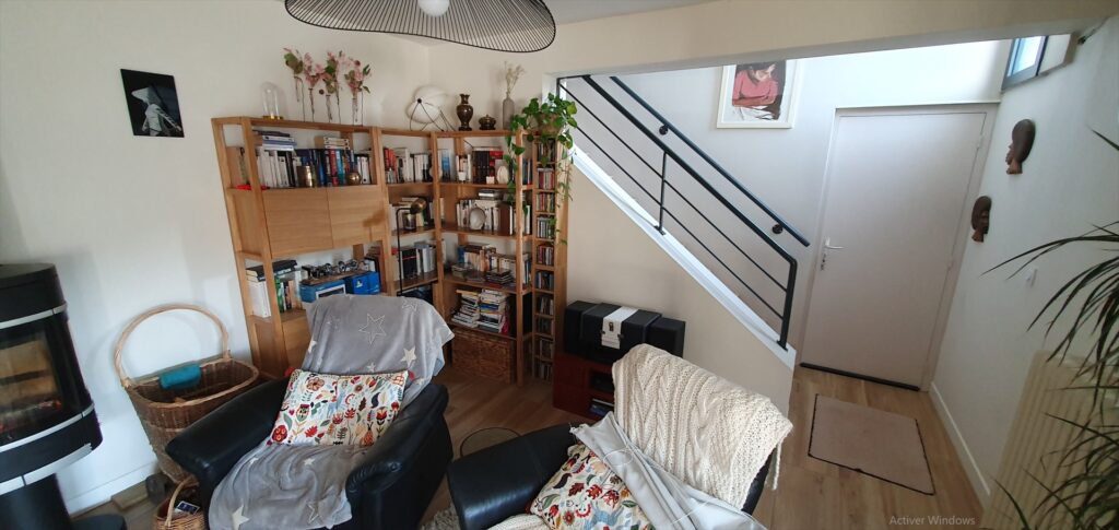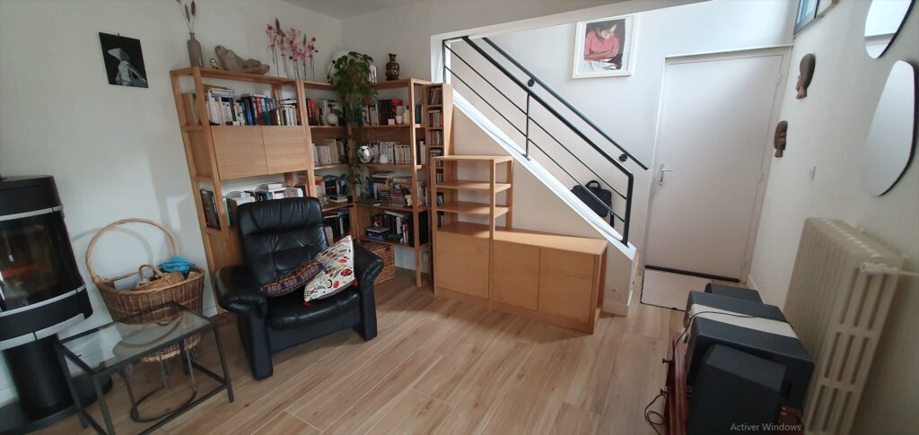 L’ensemble est teinté en pin sylvestre avec une finition par vernis satiné pour s’accorder avec les boiseries déjà présentes.