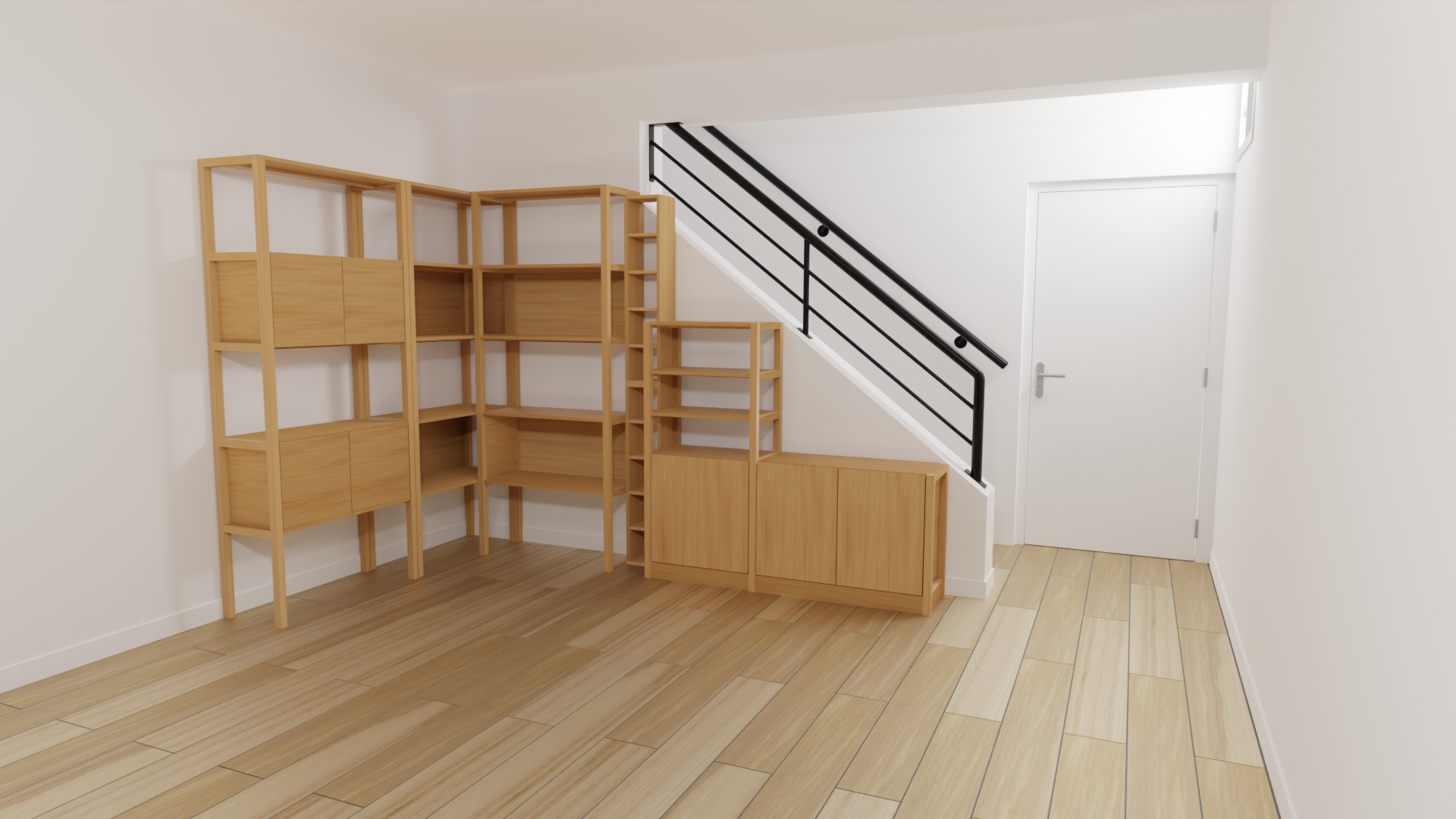 Réalisation de deux buffets et d’une étagère en mélaminé et frêne massif teinté.