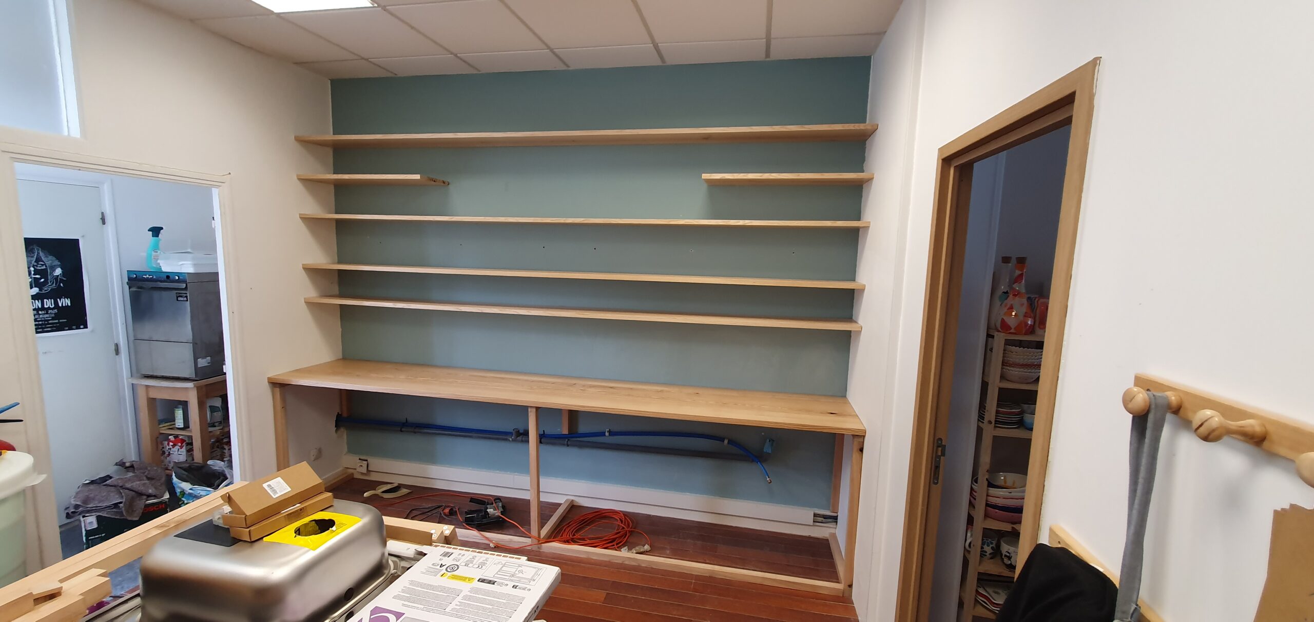 Afin d’optimiser leur espace de travail, Manon et Juliette m’ont sollicités pour créer un plan de travail et des étagères, afin de ranger leur matériel et entreposer les créations en céramique de leurs clients, réalisés au cours de leurs ateliers.